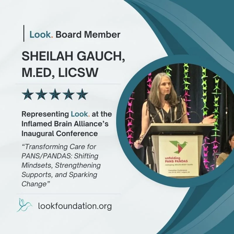 We’re incredibly proud of Look. Board Member Sheilah Gauch, LICSW, M.Ed who was invited to join the world’s leading experts in PANS/PANDAS at the Inflamed Brain Alliance’s inaugural conference. Sheilah shared her expertise as a mental health professional through both panel discussions and a powerful talk titled "Transforming Care for PANS/PANDAS: Shifting Mindsets, Strengthening Supports, and Sparking Change." In her presentation, she shed light on the trauma many families experience, the importance of advocacy, and the urgency of breaking down silos between medical and mental health professionals to create true, lasting healing.