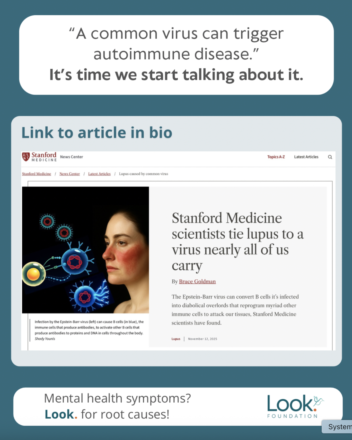 A major Stanford Medicine study has just delivered one of the most important autoimmune discoveries in decades and it directly reinforces what we at the Look. Foundation advocates for: look for the root cause. Researchers have identified Epstein-Barr virus (EBV) as the driver behind 100% of lupus cases studied.